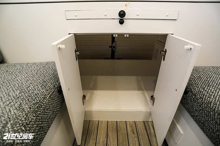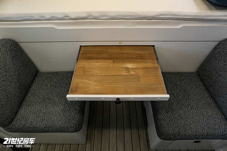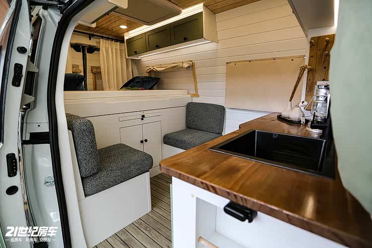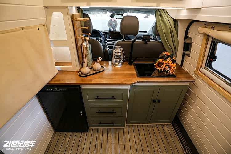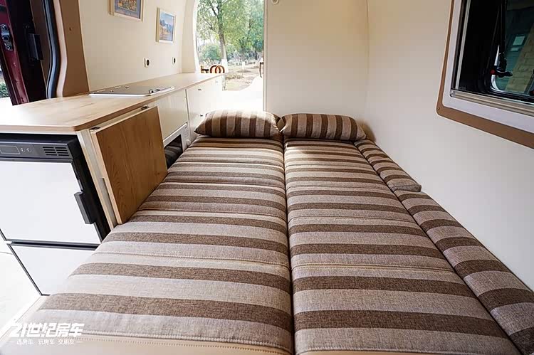 生活区由厨房区、对向座椅、尾置横床组成。厨房区台面内嵌洗手池和可当操作台,下方有储物空间和冰箱。对向侧座驻车时可供 2 人休息,中间有抽拉式餐桌。后置拼床操作简单,满足两个人的睡眠需求,下方还有较大的储物空间。