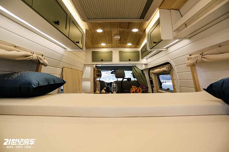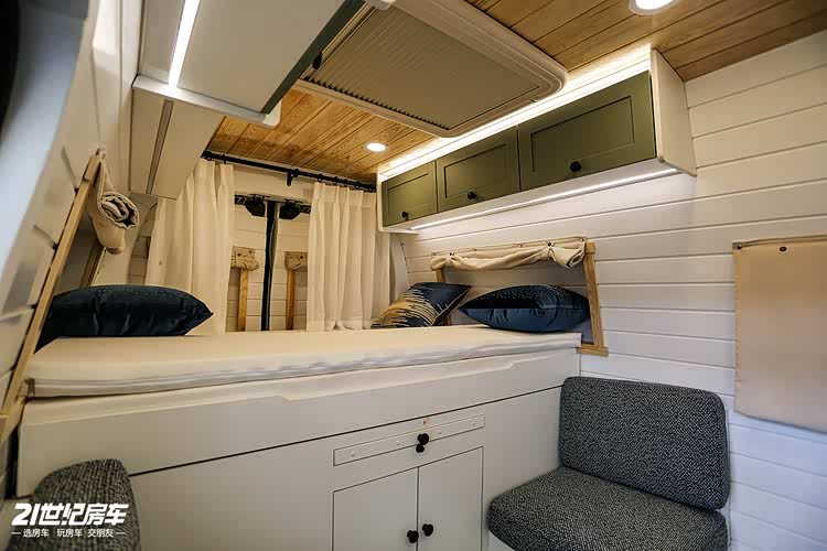 内饰与外观相互呼应,同样豆绿的柜门板,车顶、车底为深色木质材质,家具内装为白色色调,表现出“小清新”特点。