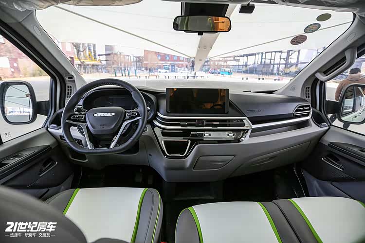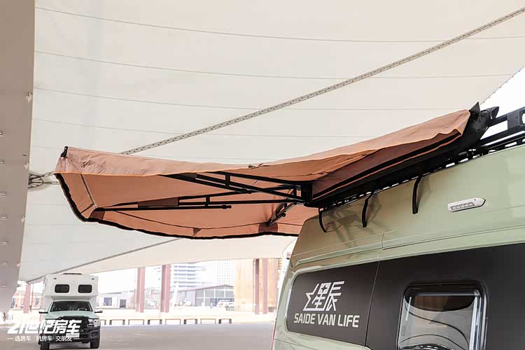 外观方面,选择豆沙绿底色搭配白色车漆,更偏向年轻群体。选装车顶行李架和侧爬梯,拓展外置储物空间,符合 Vanlife 车型调性。车身尺寸比城市 MPV 稍大,不足 2.5 米的车高仍然能兼顾城市通勤。