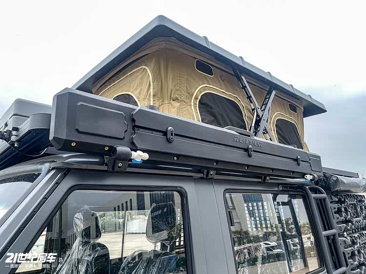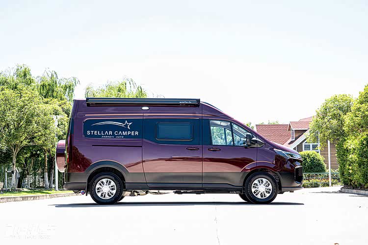外观方面,选择暗红色金属漆,左右后窗封闭式处理并印有标志,额头有定制天窗和灯饰,车侧有户外遮阳棚,尾部悬挂备胎,车身尺寸为5364x2030x2420mm,C 本可驾驭,车高较高但驾驶质感灵动。
