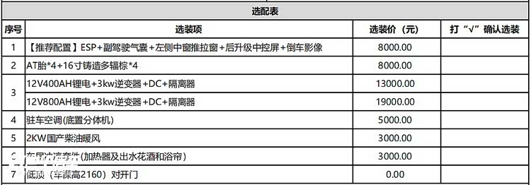 水电方面,戴德驾居还提供了丰富的选装配件,包括12V400AH 或 12V800AH 锂电池、DC 充电模块、3kw 逆变器、驻车空调、2kW 柴油风暖及车尾冲凉套件系统。