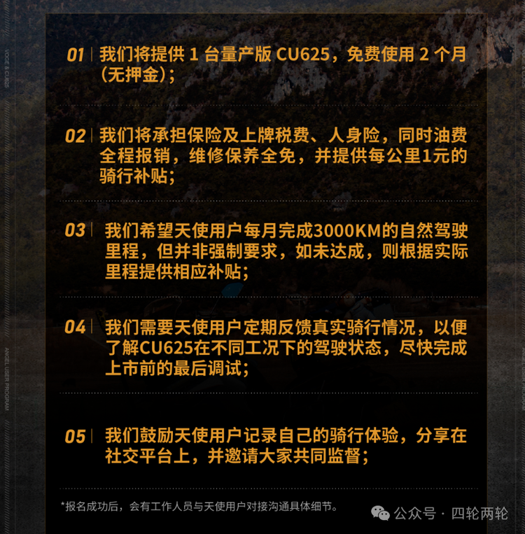 车家号·0浏览·2024-12-13 16:10 · 湖北每公里补贴1元,又有国产摩托车品牌开始了共创计划,就在刚刚无极官方宣布,将招募20名天使用户,用2个月的时间,共同完全12万公里的测试里程,工厂免费提供一台量产版CU625之外,不仅会承担车辆后续上牌、油费、保养等一切费用,另外还将提供每公里1元的骑行补贴,值得关注的是工厂还为每名天使用户都买了人身意外险。