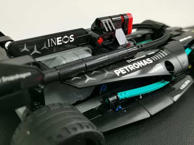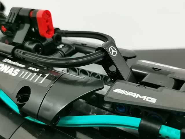 赛车模型的HALO系统采用了橡胶材质,弹性和延展性更好,还巧妙融合了奔驰品牌LOGO,前部机舱的两侧还有AMG的标识。