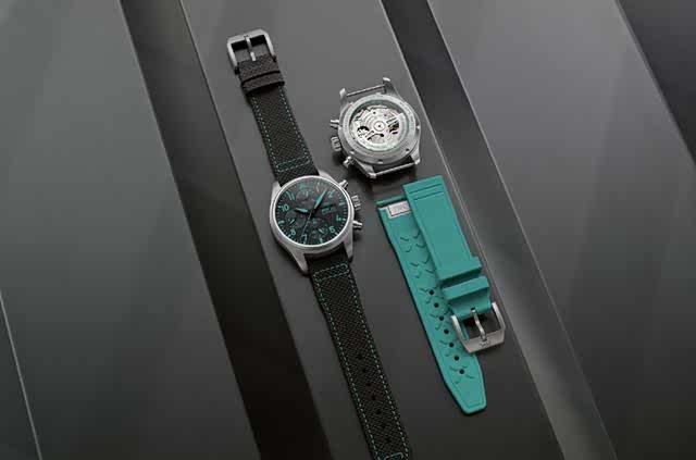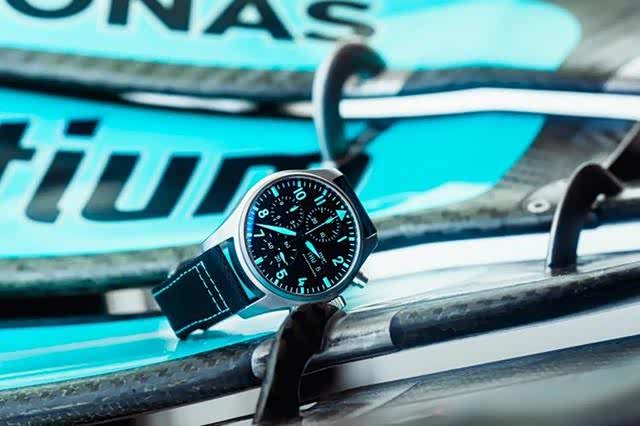 第二款腕表是2022年推出的飞行员计时腕表41“梅赛德斯-AMG马石油F1车队”特别款(型号:IW388108),经典的“飞计”采用了5N级钛材质表壳,黑色表盘搭配马石油绿元素,显示清晰直观,很容易让人联想到梅赛德斯-AMG F1赛车涂装。机芯方面,同样采用了69385型机芯,有背透,在此就不再赘述了。