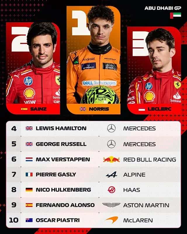 最后的结果,大家都知道了。诺里斯拿下收官战的冠军,迈凯伦获得了年度车队总冠军;法拉利车队的两位车手赛恩斯和勒克莱尔,分获亚军和季军;梅赛德斯-AMG车队的汉密尔顿和拉塞尔位列第四和第五。