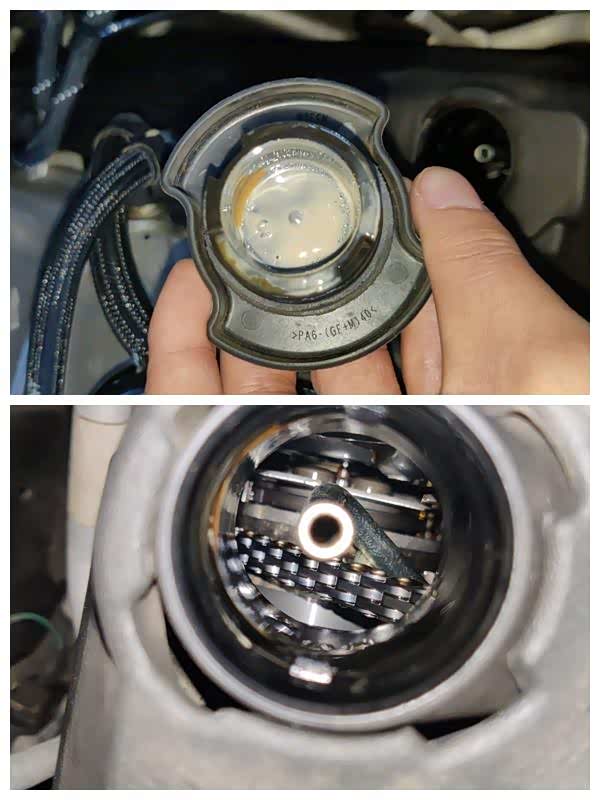 不过打开机油盖就看到问题了,机油乳化。这个问题说大不大,说小也不小,因为这里是东北,气候寒冷,零下二十度属于家常便饭,如果经常短途行驶,发动机水温没有完全上来的话,那么发动机内部的水汽潮气就会蒸发到机油盖的位置,形成机油乳化,这种现象是不需要维修的。