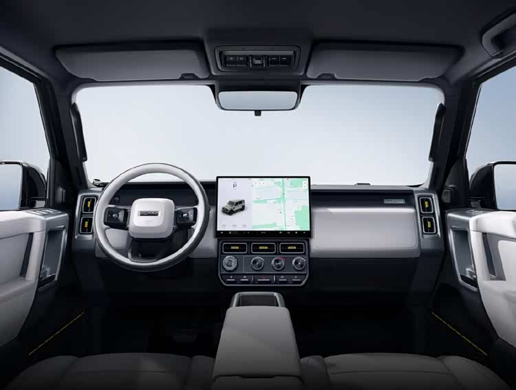 iCAR V23的内饰也有十足的越野风格,中控台硬朗平直,台面几乎垂直于地板,给人厚重宽敞的视觉感受。同时,全系标配了一块2.5K的15.4英寸中控大屏,智能车机以8155芯片作为算力支持,智能语音控制支持连续语音输出,在同价位内,它的智能座舱和吉利银河E5、比亚迪元PLUS齐平。