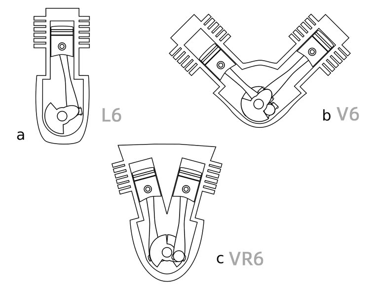 VR6专为横向发动机安装和 FWD(前轮驱动)车辆开发。一般来说,横置前驱的都是家用车,价格较低,这意味着VR6要控制成本,同时要控制尺寸,大众设计了这种高度紧凑的发动机,气缸组之间的夹角只有10.5到15度,而传统的V6角度范围为45到90度。