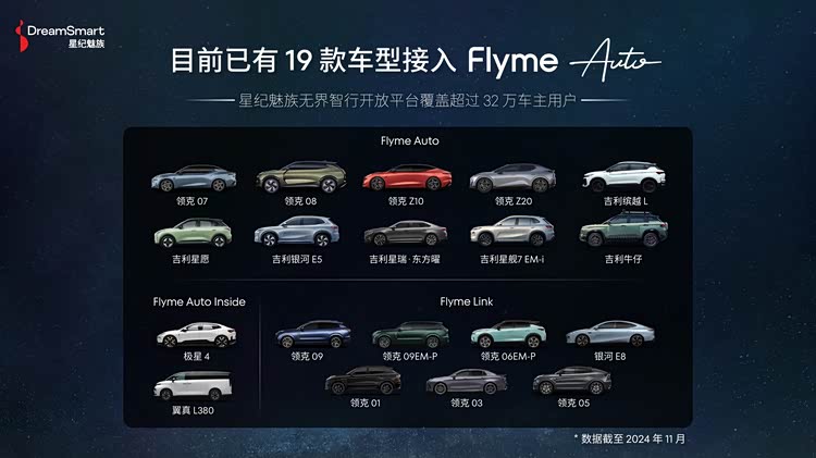 截至今年11月,Flyme Auto 已经完成 1000多个功能的开发,覆盖超过 32 万车主用户,无界智行开放平台接入领克、吉利银河等多个品牌的 19 款车型,是目前搭载上市车型最多的智能座舱操作系统,使星纪魅族成为中国头部智能座舱提供商之一。 12月6日,吉利汽车宣布,旗下银河系列车型将在明年全系上车Flyme Auto。
