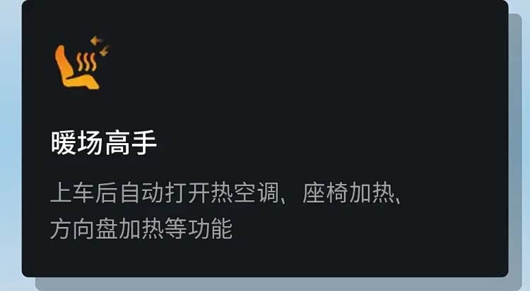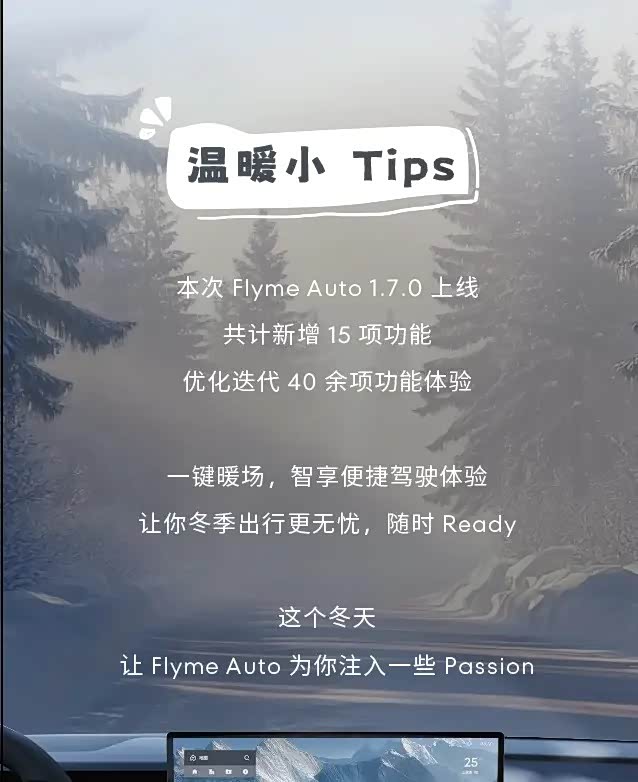 此外,Flyme Auto 1.7.0带来暖场高手、暖充躺平、除雾王者等冬日场景卡片,三种场景针对用户的细致需求做出提前预设,无需用户逐一设置,上车即可自动运行,全面提升暖身、驻车、除霜等低温用车环节的便捷性和舒适感,让用车体验从繁琐转向轻松从容。