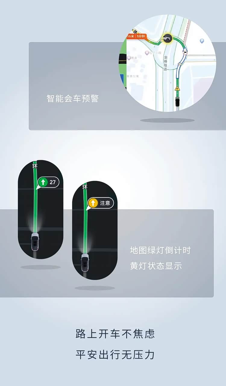 新增的绿灯倒计时与黄灯状态提示,可精准提醒驾驶员信号变化,帮助用户快速决策;盲区会车预警功能通过语音播报与地图提示,及时提醒驾驶员在无灯路口及弯道盲区处注意对向来车。这些功能的引入,不仅缓解了驾驶焦虑,更让用户在多场景下享受更流畅、高效的驾乘体验。