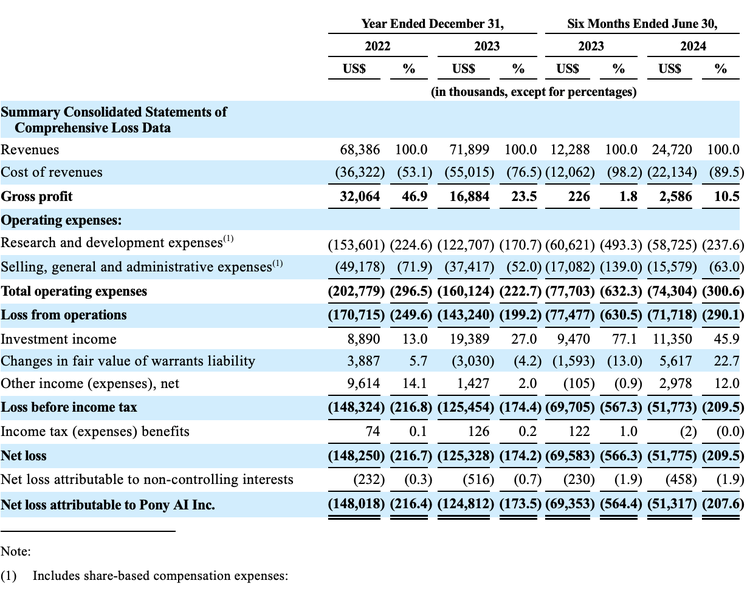 所以即使营收增长都非常亮眼,但小马智行依旧还在亏损中。2022年至2024年上半年,净亏损分别为1.48亿美元、1.25亿美元、5178万美元,两年半净亏合计约3.25亿美元。不过从这些数字也可以看到,小马智行的净亏损在逐年收窄,盈利曙光就在眼前。
