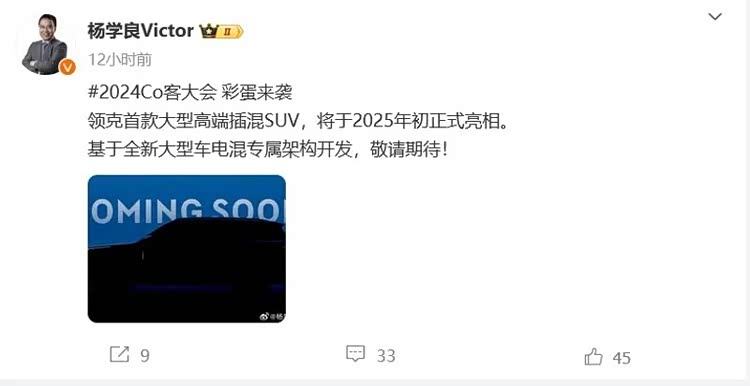 车家号·0浏览·2024-12-23 16:53 · 湖南省近日,吉利浙江吉利控股集团的高级副总裁杨学良通过微博向公众透露了一个令人振奋的消息:领克品牌的首款大型高端插电混动SUV预计将在2025年初正式亮相。这款新车将基于吉利全新研发的大型车电混专属架构打造,预示着领克品牌在豪华SUV市场的一次全新尝试与突破。