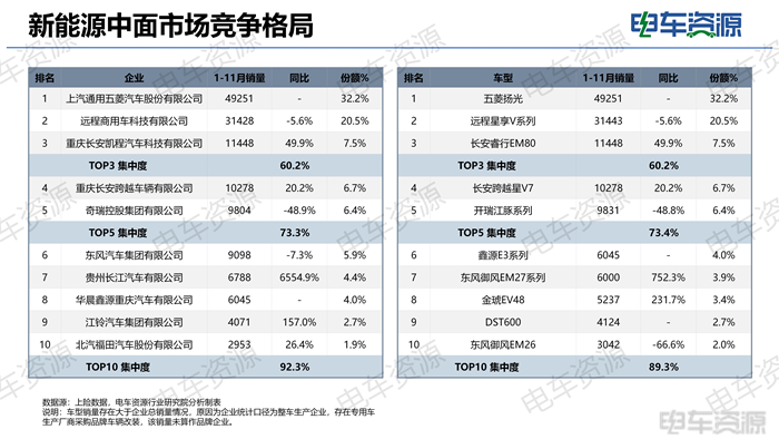 作为新能源物流车最大的市场,新能源中面市场的竞争较为激烈,作为深耕商用车行业四十余年、坐拥千万级基盘用户的行业龙头,五菱扬光持续火爆。1-11月上汽通用五菱累计销量为49251辆,市场占比32.2%,稳坐中面市场销冠,五菱扬光是中面最热销车型。行业CR3为60.2%,集中度较高。