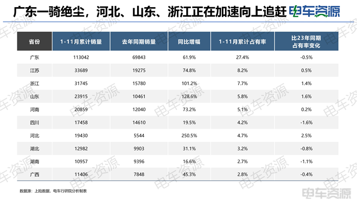 广东是新能源物流车最主要的市场,1-11月累计销量为113042辆,同比涨幅61.9%,其中深圳和广州销量最多,两者销量合计占市场18.8%,近2成。河北涨幅最大,1-11月累计销量为19430,成倍数增长。