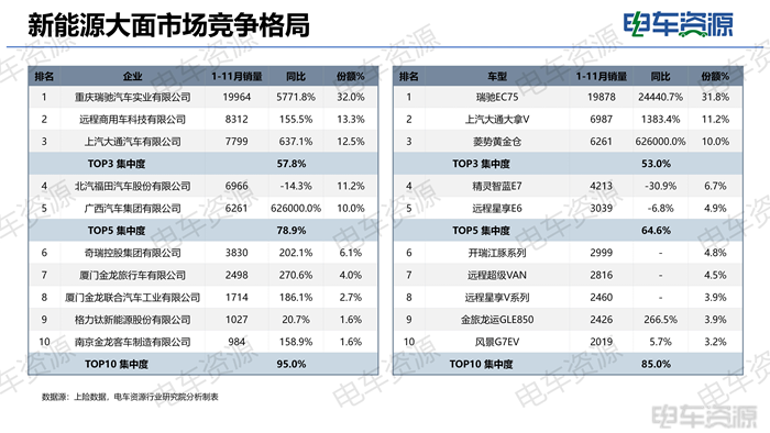 大面车型整体上涨明显,瑞驰汽车1-11月销量同比大幅上涨,累计销量为19964辆,同比增长超50倍,市场份额为32.0%,瑞驰EC75是中面市场最畅销车型。