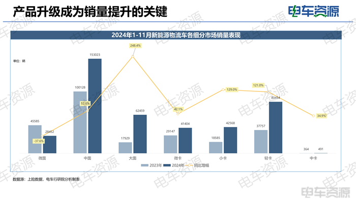 中面是新能源物流车最主要的车型,2024年1-11月销量累计153023辆,同比提升52.8%,大面车型增长最快,同比增长248.4%,主要原因是多加家企业针对市场需求痛点不断开发大面车型,在产品品质及竞争力的加持下,推动其销量快速增长。
