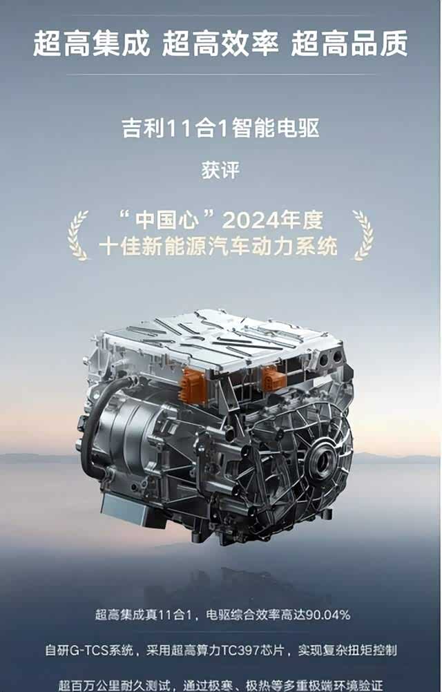“中国心”年度十佳新能源汽车动力系统评选在行业内极具影响力,其入围产品几乎涵盖了国内所有主流新能源动力系统。吉利 11 合 1 智能电驱系统在众多强劲竞争对手中脱颖而出,历经专家初审、实车测试等多道严格关卡。在评选过程中,它赢得了专家评审委员会的一致赞誉。上海交通大学汽车工程研究院副院长、评选专家评审委员会主任殷承良就指出,吉利 11 合 1 智能电驱堪称当前业内集成度的典范,以一颗控制芯片完成过去六个不同控制器的工作,使得体积与重量大幅缩减,性能却显著提升,其优异性能在众多参选产品中独树一帜。