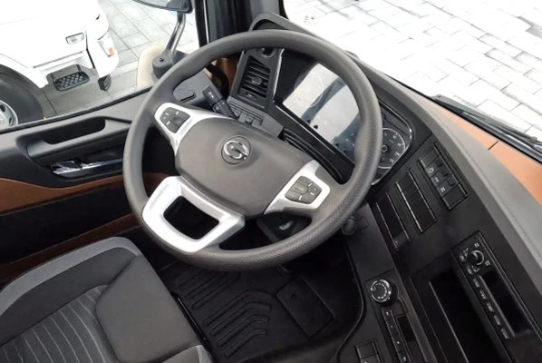 驾驶室内部以灰色为主色调,并配有黑色和棕色,主驾采用可多项调节气囊减震座椅、3幅式多功能方向盘,并在方向盘的3点和9点钟位置做了加强握持设计。