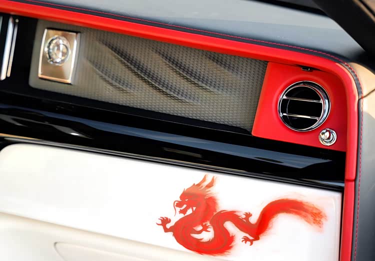 造型方面,幻影“龙年”提供两种涂装方案,分别是银(Silver)+樱桃红(Cherry Red)和水晶单体黑(Monolithic Black with a Crystal)。Coachline腰线使用凤凰红色(Phoenix Red),并且配有面向右侧“龙”图案,象征着东方太阳升起的地方。