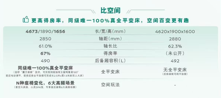 深蓝S05虽然后备箱和储物空间不错,但后排座椅放倒后仅有不到1.7米的长度,想要躺得舒服些,可能有点局限。相比之下,启辰VX6的后排完全放平后,给你超大空间,躺平更舒适。