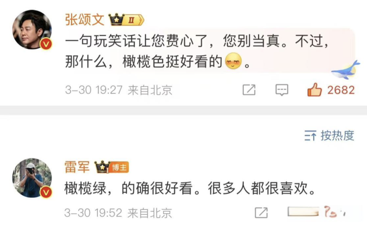 随后,雷军回复张颂文:“我们已为您准备了一辆,4月3日开始交车,欢迎你来。你喜欢哪种颜色?”张颂文看到雷军真要送自己车,暗示直接改为明示:“一句玩笑话让您费心了,您别当真。不过,那什么,橄榄色挺好看的。”