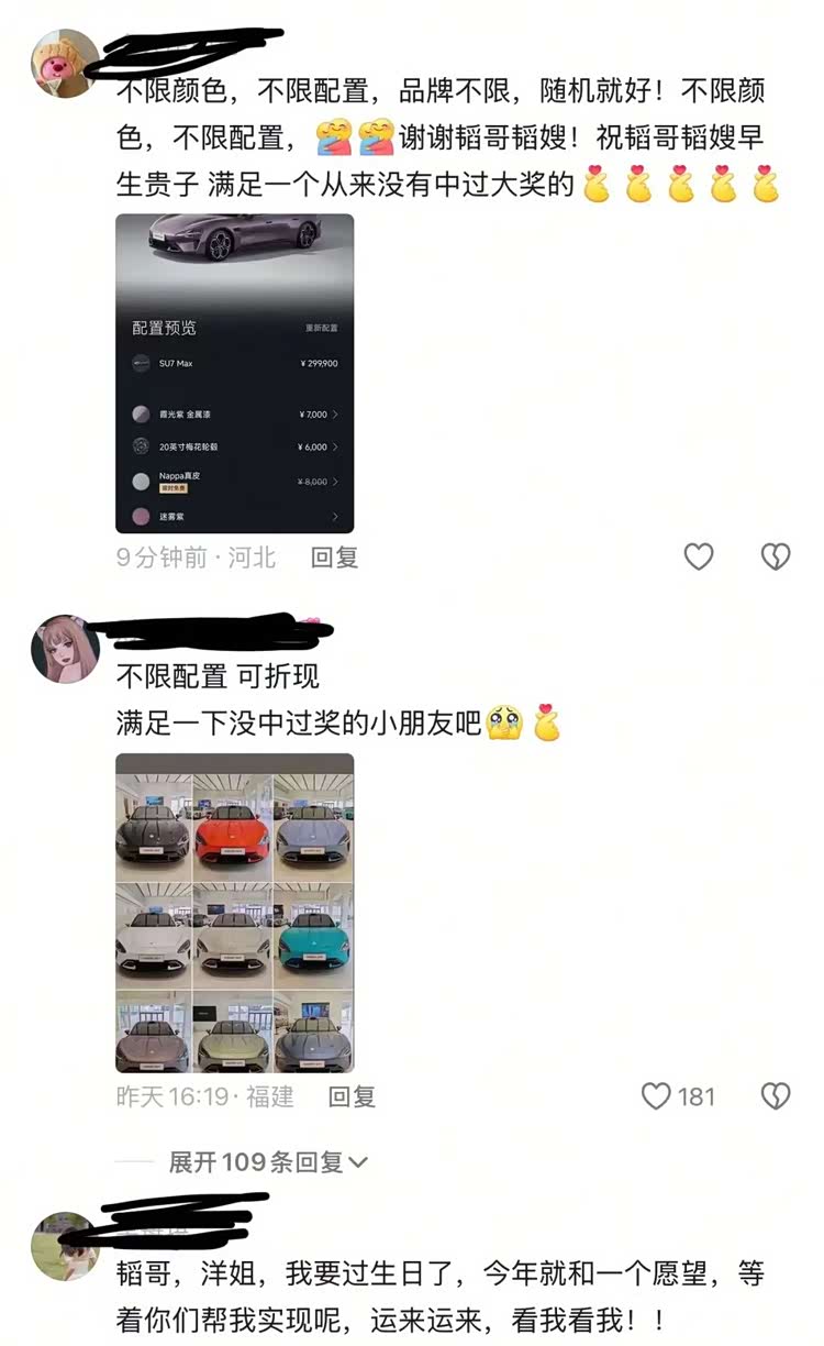 同时,自从黄子韬将这个FLAG立下之后,许多粉丝都在黄子韬夫妇的抖音评论区留言,甚至将自己喜欢车型的具体型号、配色等都详细列出,网友们的评论不约而同的保持队形。其中,最新一条作品的评论数超过310万条,而据统计,粉丝最想抽到的车型便是小米SU7。