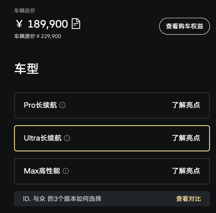ID.与众目前提供三个版本,分别是Pro长续航、Ultra长续航和Max高性能版。它们可以简单理解为低配、中配和高配,售价依次为16.99万元、18.99万元和20.99万元。值得一提的是,ID.与众采用了全国统一售价的策略,不用担心讨价还价的问题,整个购买过程就像选购新势力品牌的车型一样省时又省心,非常适合追求高效的消费者。