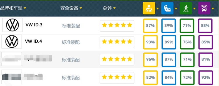 同属全球MEB平台的ID.3与ID.4都在欧洲进行了Euro-NCAP试验(含侧柱碰试验),均取得了五星好成绩。