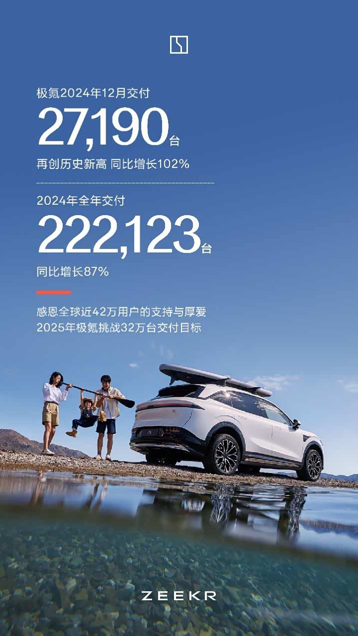 •极氪12月交付27,190台,同比增长102%。极氪2024全年共交付222,123台,同比增长87%。同时,极氪正式公布2025年将挑战32万台的销量目标。