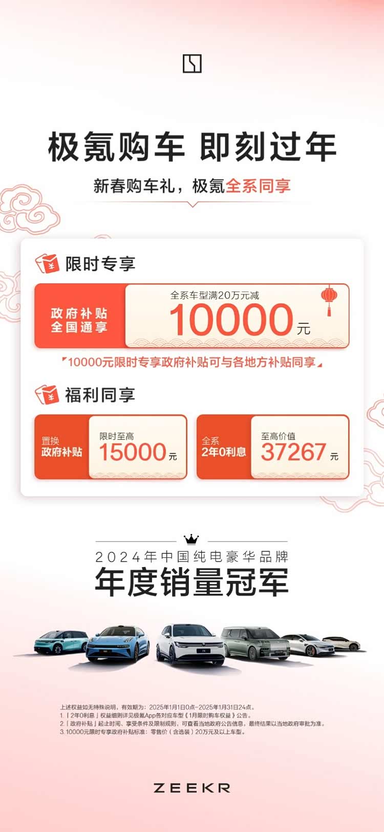 同日,极氪推出1月购车权益。2025年1月1日至1月31日(含)期间,极氪全系车型可享满20万元减1万元的政府限时专享补贴,全国通享并可与各地其他补贴政策同享。此外,极氪全系车型可享2年0利息金融方案,至高价值37,267元,还可叠加限时至高1.5万元的政府置换补贴。