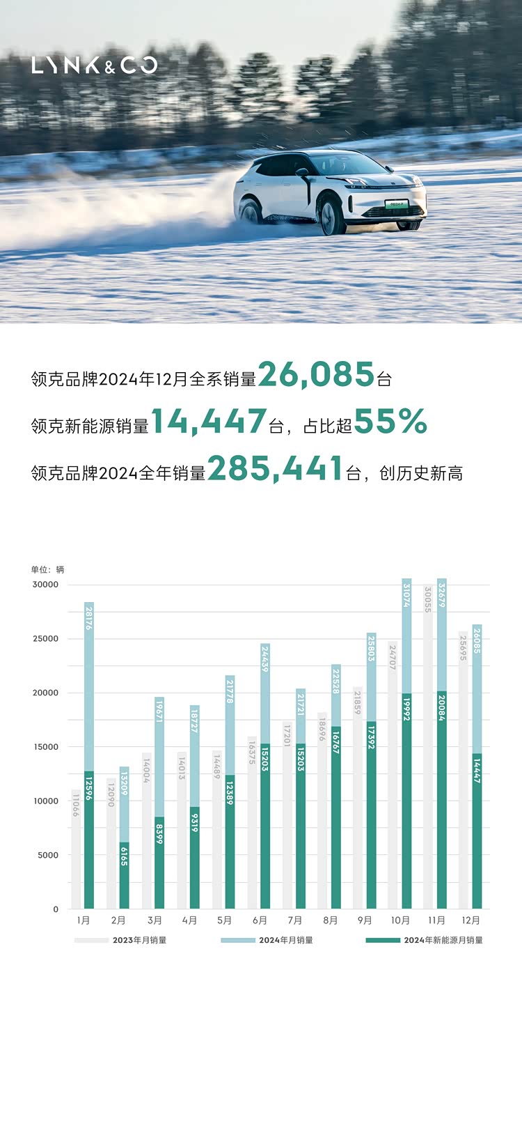 【2025年1月1日,杭州】今日,领克对外公布2024年12月销量为26,085台,其中,新能源车型销量为14,447台,占比超55%,领克EM-P成为品牌销量增长的强劲引擎。2024年,领克汽车全年累计销量达285,441台,同比增长近30%,实现历史性突破。从第一款车型上市至今,领克累计销量已超133万台,以独特的魅力不断吸引年轻态用户群体。
