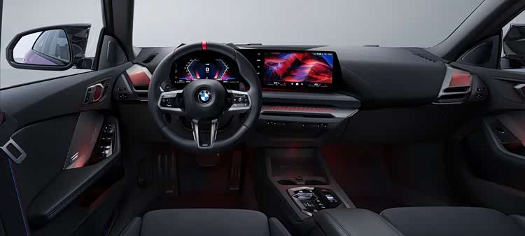 全新宝马M235L四门轿跑车内饰的设计排布与225L常规版车型没有明显差异,一体式悬浮曲面屏、拨杆式电子换挡机构等元素均未有缺席。在此基础上,全新宝马M235L四门轿跑车搭载带红色回正标识的方向盘,并配套M三色条纹前排安全带。