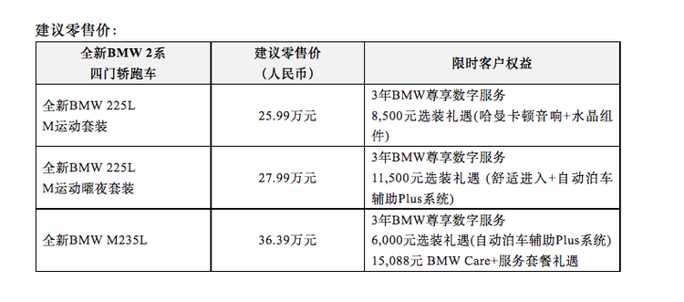 2025年1月2日,宝马中国官方宣布,全新国产宝马2系四门轿跑车及M235L四门轿跑车正式上市,官方指导价25.99万元起,其中M235L四门轿跑车的官方指导价为36.39万元。据悉,全新国产宝马2系四门轿跑车即日起在沈阳工厂投产,这也是华晨宝马首次生产四门轿跑车型和M Performance性能轿车。