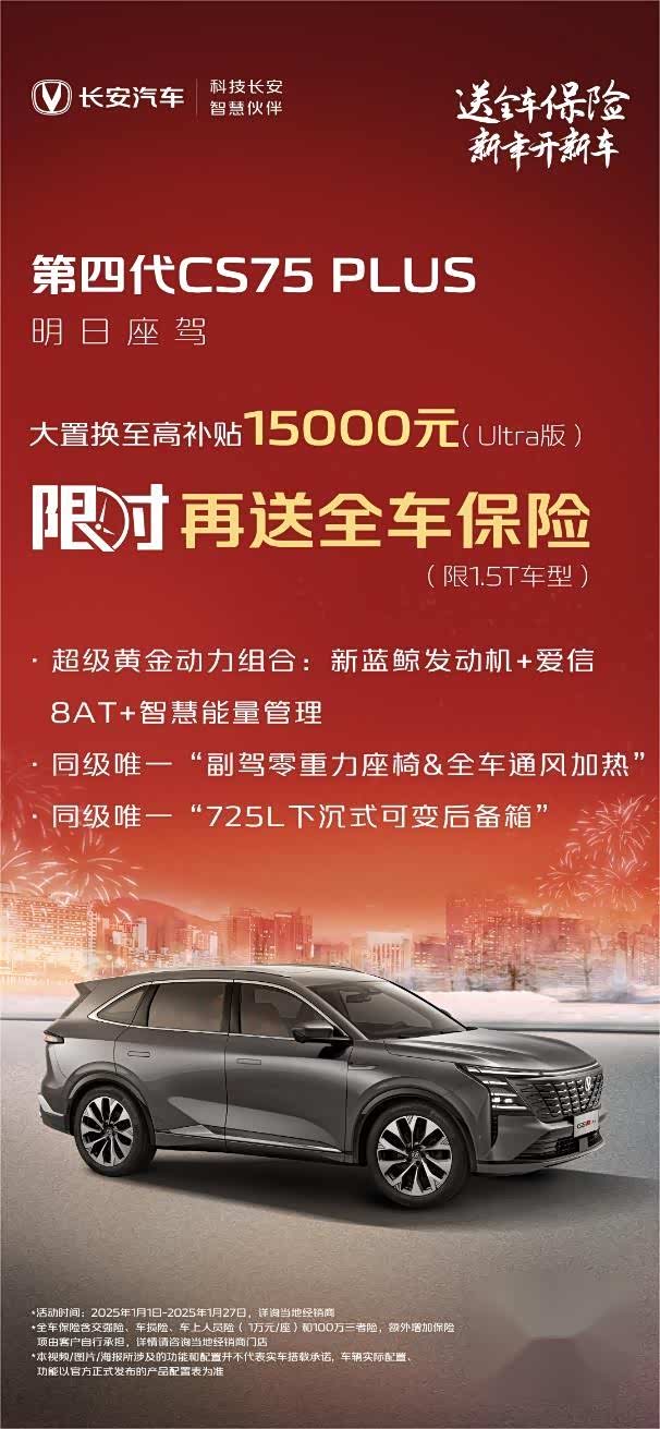 随着2025年的到来,长安汽车推出了“送全车保险,新年开新车”活动。购买长安第四代CS75PLUS即可享受超值购车福利。1.5T车型可享限时送全车保险等权益,2.0T车型则可享受大置换至高15000元的补贴,为消费者带来了更加丰富的选择。