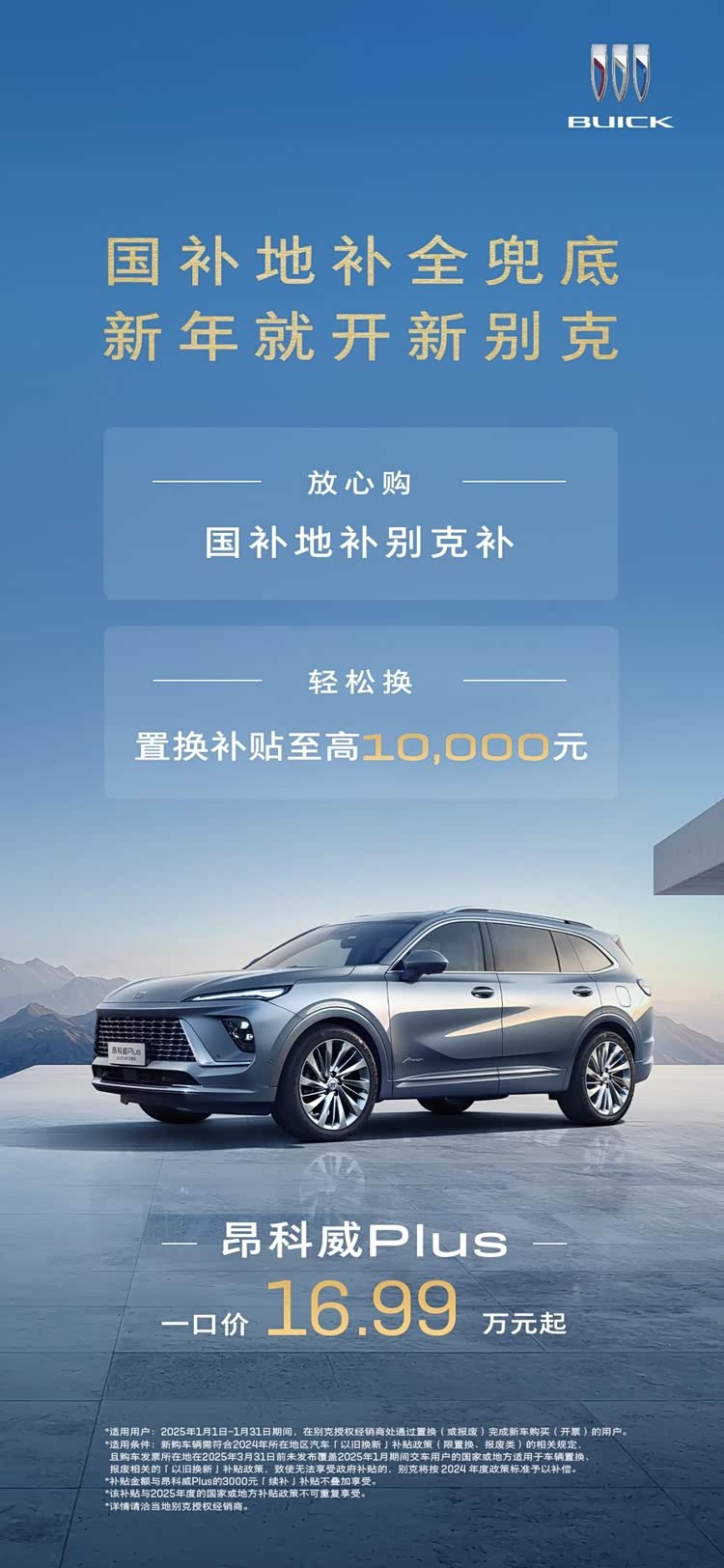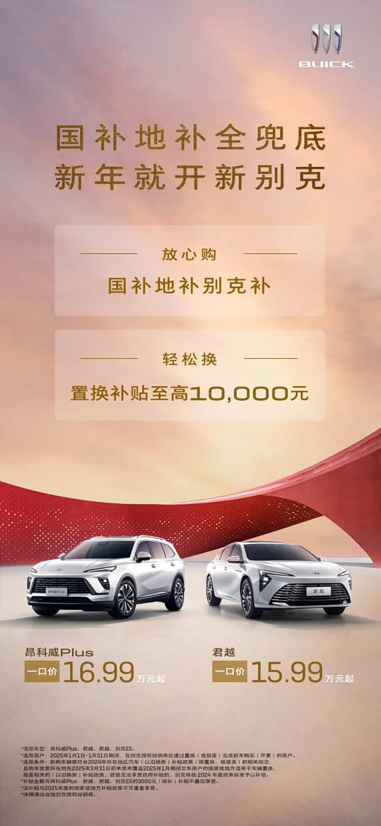 为了让消费者购车更无压力,别克此次推出的置换补贴政策可谓诚意十足。活动期间(2025年1月1日至1月31日),消费者只需在别克授权经销商处,通过置换(或报废)购买 别克昂科威(参数|询价)Plus、君越、君威以及别克E5,即可享受国补地补兜底补偿,并叠加享受别克品牌官方置换补贴。双重补贴,优惠翻倍,让您的购车预算更加灵活,轻松实现新车梦。