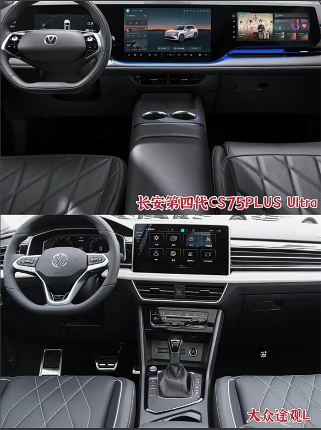 相比之下,大众途观L(330TSI R-Line龙耀版)虽配备了自动泊车和360°全景影像,但却没有辅助驾驶功能,且只搭载了10.3英寸全数字液晶仪表12英寸中控触控液晶屏,对比长安第四代CS75PLUS Ultra的37寸一体式悬浮三联屏(10.25寸全液晶仪表屏+14.6寸高清中控屏+12.3寸副驾屏)在功能的全面性和智能化程度上,显然欠缺。