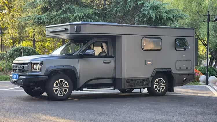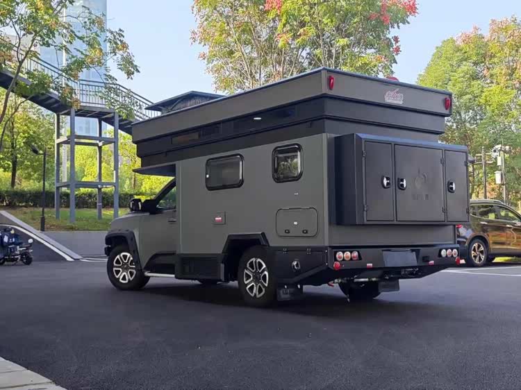 动力方面,整车搭载2.3T柴油发动机,匹配8AT变速箱,4×4分时四驱系统,发动机最大功率为130kW,峰值扭矩达450N·m,满足国六排放标准。车侧设施丰富,配备有遮阳棚(3m)、室外LED照明、注水口、充电口、下沉式柴油灶等。