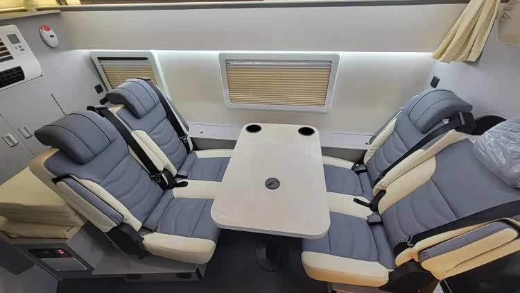 会客区一侧配备有窗户,方便通风换气。另外本车休息区并没有设计固定区域,尾部区域加持沙发组合升降桌,可形成临时床区域,带来额外的休息空间。会客区采用双人对坐式沙发设计,中间配备有气动升降桌,便于车友在此用餐和娱乐。