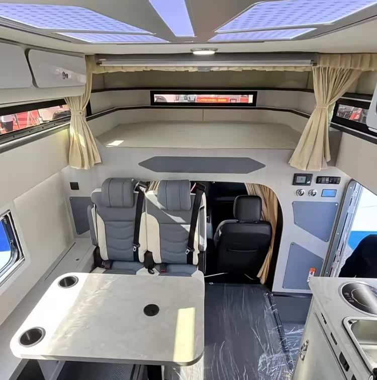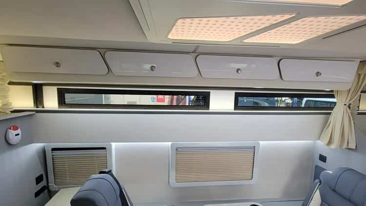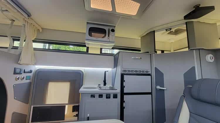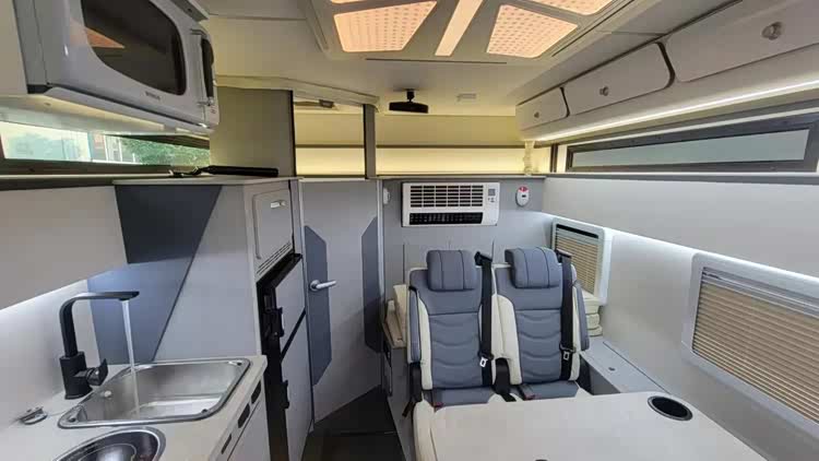 本车采用前上门设计,内饰布局清晰,前方为驾驶室,中部为会客区、厨房区,尾部为卫生间区域,内部生活设施齐全。驾驶室上方配备有额头床,床铺尺寸宽阔,满足双人休憩使用。