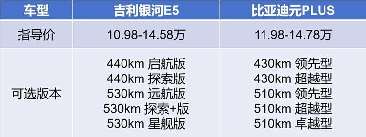 银河E5的售价为10.98万到14.58万元,共计5个版本可选,根据续航里程可分为440公里高低配和530公里的高中低配。元PLUS也是这样划分配置版本,各版本都能和银河E5一一对应上,但价格均比后者更贵,顶配差价最小仅2千元,入门版差价最大为1万元。