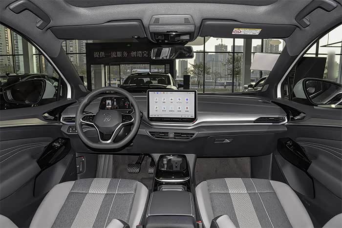 内饰部分,2025款大众ID.4 CROZZ延续了老款车型设计,其中在细节部分调整了内饰材质纹理和缝线颜色,使得内饰看起来更为简约了。另外新款车型启用了全新怀挡式换挡机构,位置由仪表盘侧面移动到方向盘右后方区域,这次挪了位置之后,让换挡操作更具便捷性。