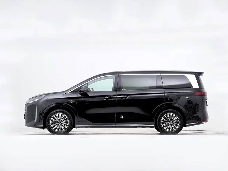 从车辆的侧面观察,它显得高大且规整,展现出一种平稳稳定的设计风格,这也是传统MPV的一部分。车身采用了隐藏式的后排侧滑门导轨和半隐藏式的门把手,而D柱的位置则用银色进行了装饰点缀。在尺寸上,其长、宽、高的比例分别是5145mm/1970mm/1805mm,轴距达到3045mm。此外,它还配备了18英寸的多个轮圈,并且轮胎是米其林品牌的聆悦系列,其规格为235/60 R18。此外,这款新车的侧滑门和尾门都配备了投影功能。当车辆处于锁车模式时,靠近侧滑门或尾门的AR投影会自动启动,用户只需轻轻踩下闪烁的图标,就能实现“隔空开门”的效果。之前发布的2025款腾势D9车型也搭载了这一功能。