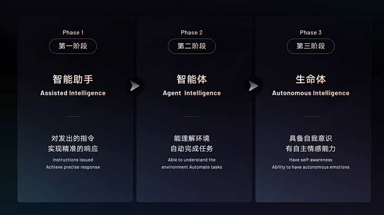 在吉利看来,智能汽车将经历“智能助手”、“智能体”和“生命体”三个发展阶段,通过“本体+智能”的不断迭代,最终成长为有温度、有情感的“出行智慧生命体”。
