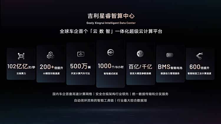 目前,吉利星睿智算中心的云端总算力已迭代到 102 亿亿次/秒,赋予车云一体 BMS 系统 AI 算力支撑和云端实时安全保护,可支持 500 万在线车辆的智算需求。