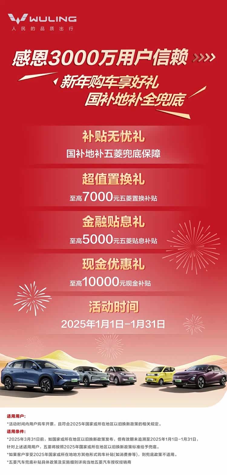 迈入 2025 年,五菱毫不懈怠,起步便如离弦之箭加速冲刺。开年即祭出新年购车五重礼,彰显其冲击更高峰的决心。“为人民造车” 从来不是一句空话,面对国家以旧换新的号召,五菱率先响应,第一重礼便是暖心兜底。在 2025 年 1 月选购五菱旗下任一车型,只要符合以旧换新政策,无论后续国家或地方补贴政策如何变化,五菱都坚定地为用户托底,给予国补地补兜底保障,让消费者购车无忧。