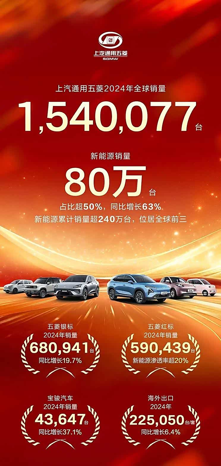 回首 2024 年,上汽通用五菱在车坛可谓是大放异彩,一路高歌猛进。在单一车型层面,宏光 MINIEV 家族持续领跑,以全年 26.11 万辆的傲人销量,稳坐 “代步之王” 的宝座,大街小巷随处可见它小巧灵动的身影,已然成为城市出行一道独特的风景线。而星光家族作为后起之秀,首年销售便突破 10 万辆大关,凭借出色的性能与亲民的价格,迅速赢得消费者的青睐,开辟出属于自己的一片天地。