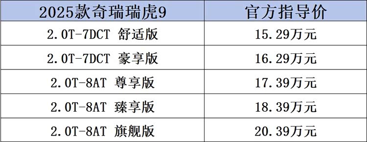 动力上,瑞虎9搭载了2.0T发动机,最大功率达到192千瓦,峰值扭矩为400牛·米。传动系统方面,提供了7挡DCT湿式双离合自动变速箱和8挡手自一体变速箱两种选择,满足不同消费者的需求。