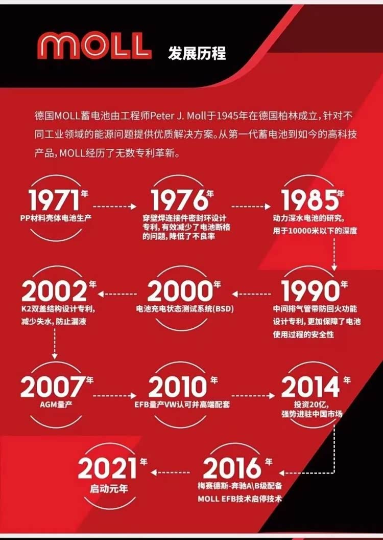 自1953年推出第一代免维护蓄电池以来,莫尔不断进行技术创新,获得了多项专利。用领先的技术研究书写铅酸蓄电池的历史篇章。如今全球闻名的德国老牌蓄电池莫尔来到中国,为中国消费者带来优质的蓄电池产品,涵盖AGM、EFB、SLI三大系列,几乎能适配所有的常规车型。