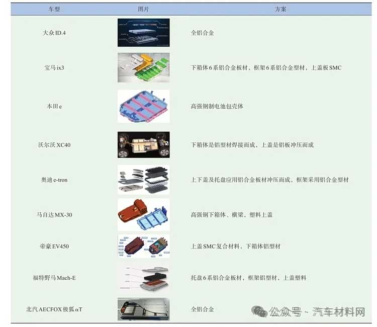 统计了近3年欧洲车身会议相应车型及国内部分电动车车型的电池包壳体方案,见下表。轻质材料凭借其密度小、比刚度大等优点,已经成为电池包壳体的首选方案,而轻质材料中,铝合金显然已成为电池包壳体的主流材料,在下壳体中铝合金使用比例超过80%,在上壳体中铝合金使用比例超过50%。